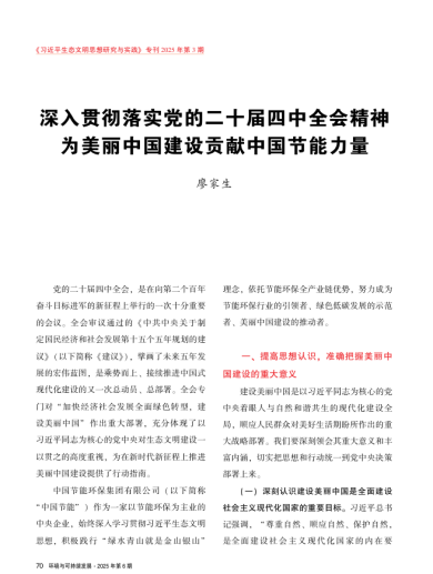(四)深刻认识建设美丽中国是彰显共建清洁美丽世界大国担当的生动实践。习近平总书记强调,建设美丽家园是人类的共同梦想。面对气候变化、生物多样性丧失等全球生态环境挑战,人类是一荣俱荣、一损俱损的命运共同体。美丽中国建设既是中国以自身努力推动解决全球环境问题的重要行动,也为世界各国探索解决生态环境问题给出了中国方案、树立了中国样板、贡献了中国智慧。中国节能必须秉持人类命运共同体理念,积极参与全球环境治理,全力服务绿色“一带一路”建设,讲好美丽中国故事,以实际行动为共建清洁美丽世界持续彰显中国力量。